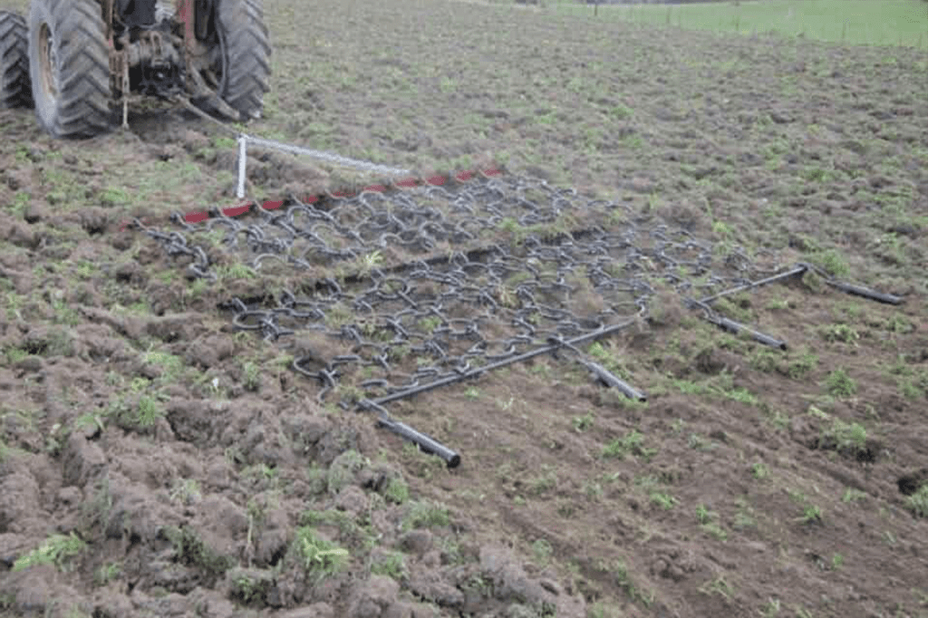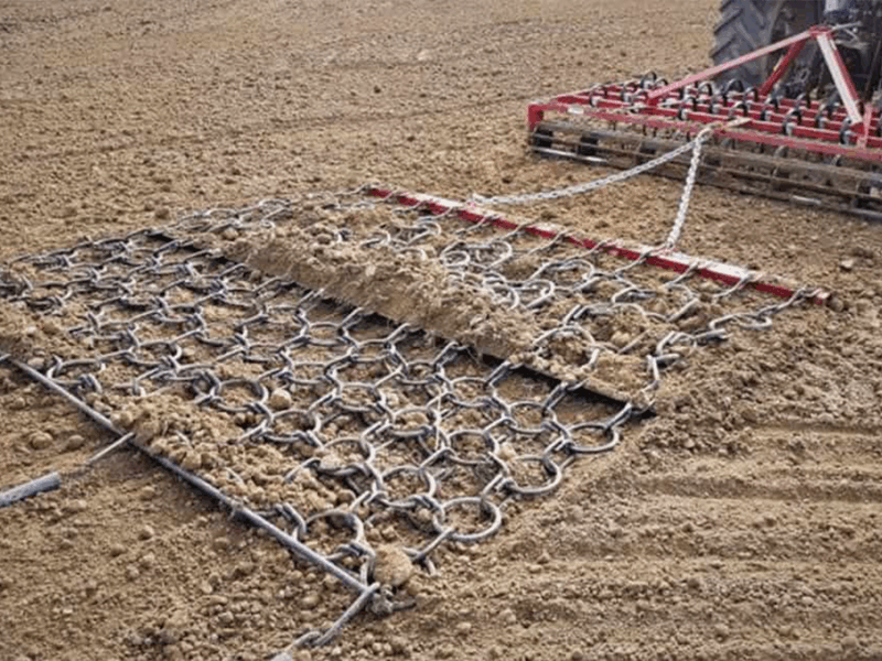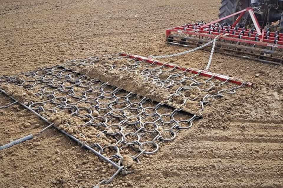 A heavy duty cultivation cover harrow with 5 rows of 16mm chain and 1.6m depth. Drag weights included. Sizes: 3.0m - 4.0m