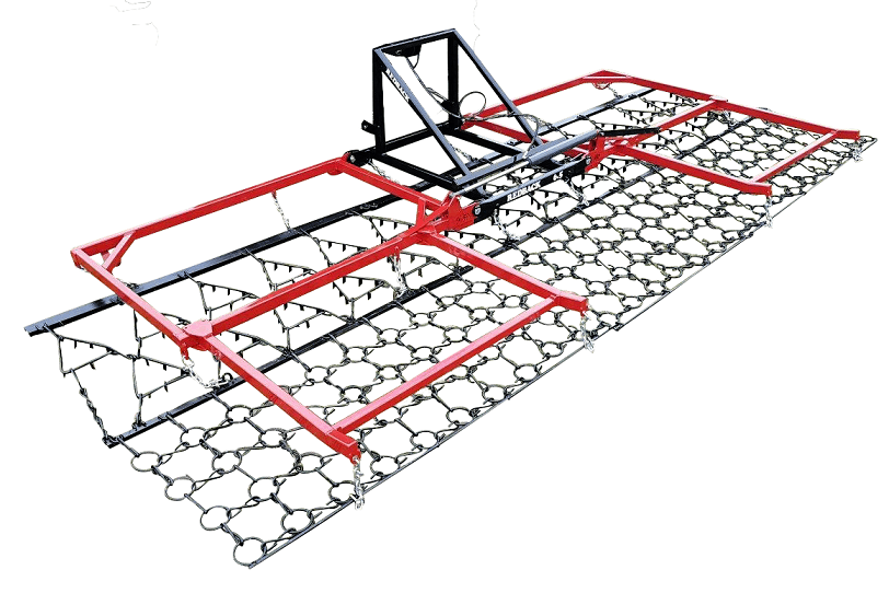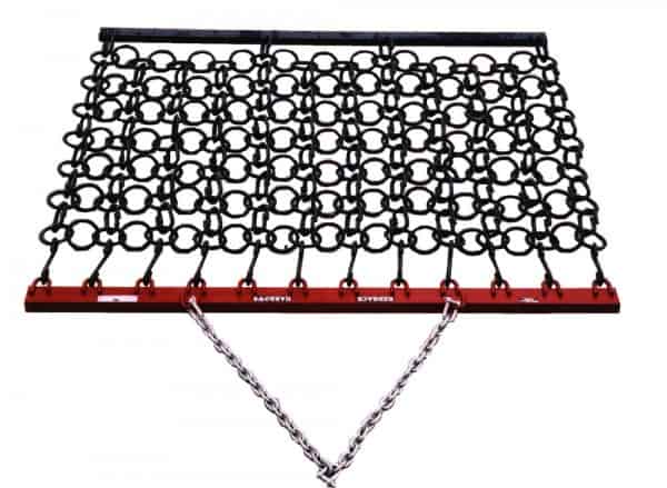 Tractor pasture harrow with 6 rows of unspiked close knit chain, lying flat for maximum spreading. Sizes from 2.5m - 4.0m